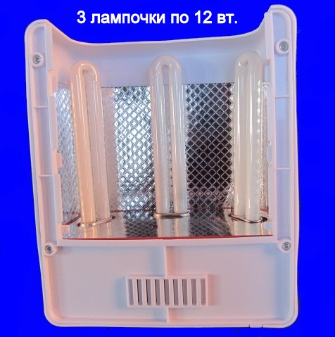 - Має 3 лампи по 12 W, 1 розміщена зверху та 2 з боків.